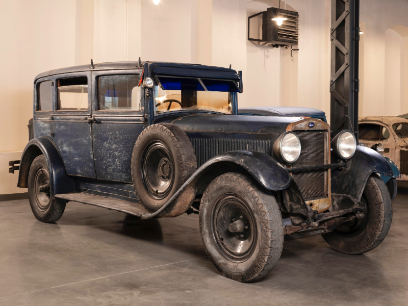 Most of the 23 displayed automobiles are in as-found or partially restored condition and originate from the years 1913 to 1948. The cars were acquired for the collection exactly as they were discovered after decades in forgotten garages and barns.
